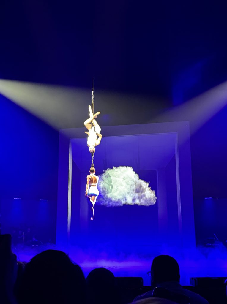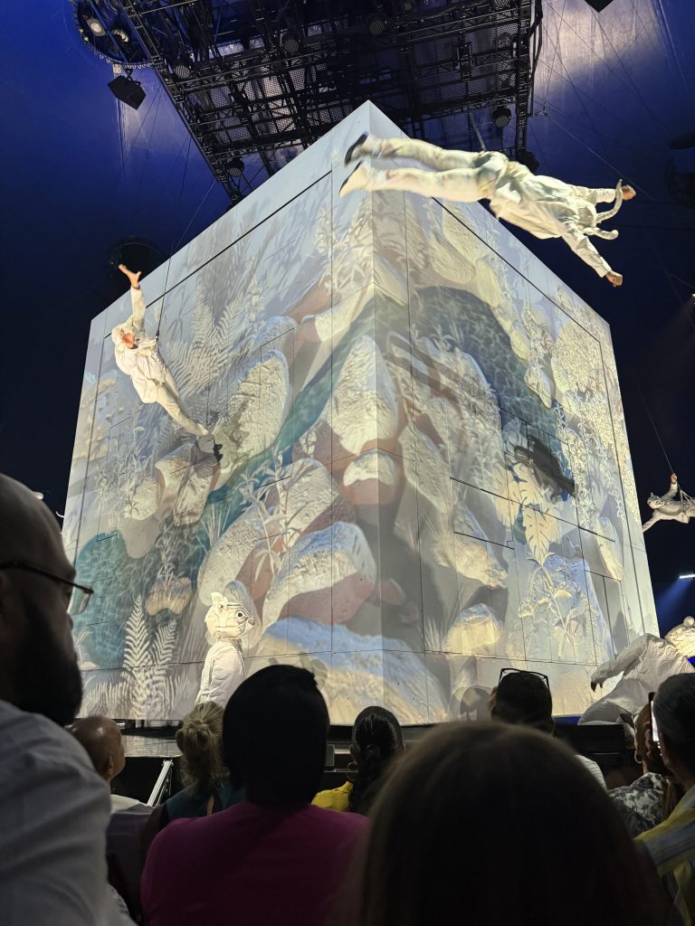 Cirque is a favorite of mine and this show was another stunner.  Every production is unique and always has amazing acrobatics, creative costumes, humor and set design that is out of this world.  Echo “explores the delicate balance between people, animals and the world we all share”.  The show had a cube that was a true masterpiece.  Every part of the show incorporated it and transformed how it looked and what it was being used for.  Whether it be the performers resembling different animals, or gigantic characters doing their thing there was something for everyone to enjoy.  This show was about 2 hours and five minutes with an intermission midway through, it was the perfect length keeping everyone interested.
